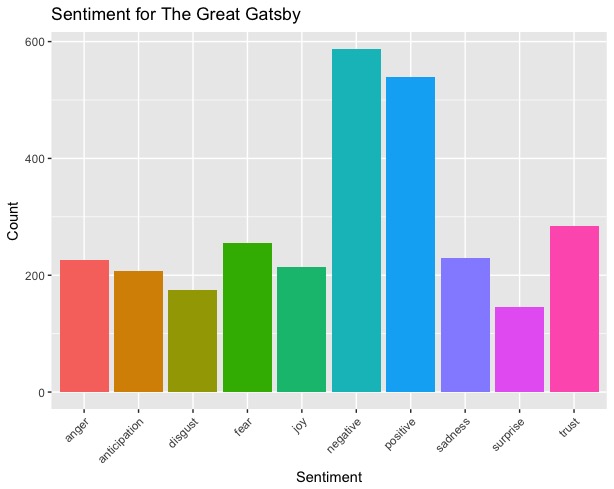 Based on the graphs, it is clear all three novels have very similar sentiments, as they are all slightly more negative than positive and all three have surprise as the lowest sentiment.