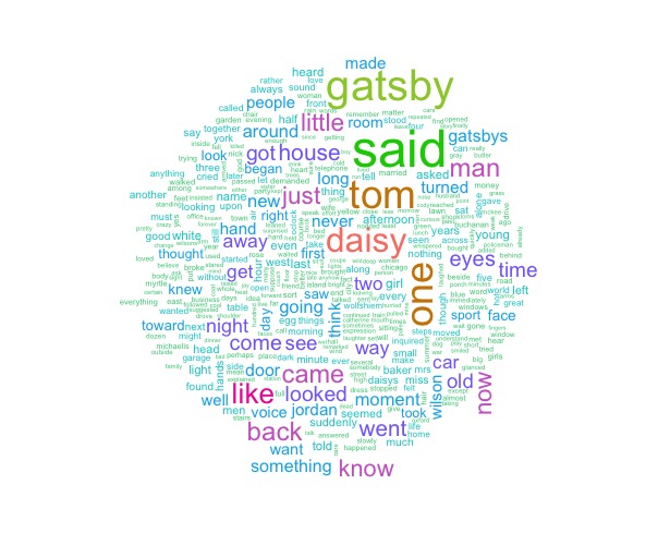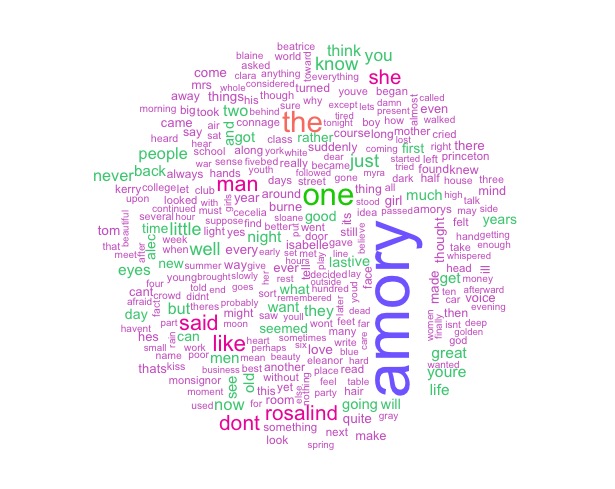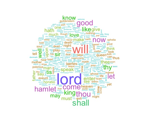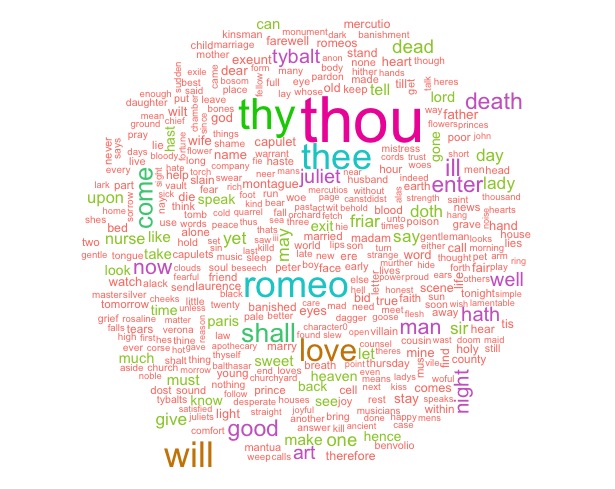 wordcloud(romeo.analysis, max.words=400, colors=c("salmon", "olivedrab3", "orchid3", "seagreen3", "orange3", "cyan3", "green3", "deepskyblue2", "slateblue1", "maroon2"))