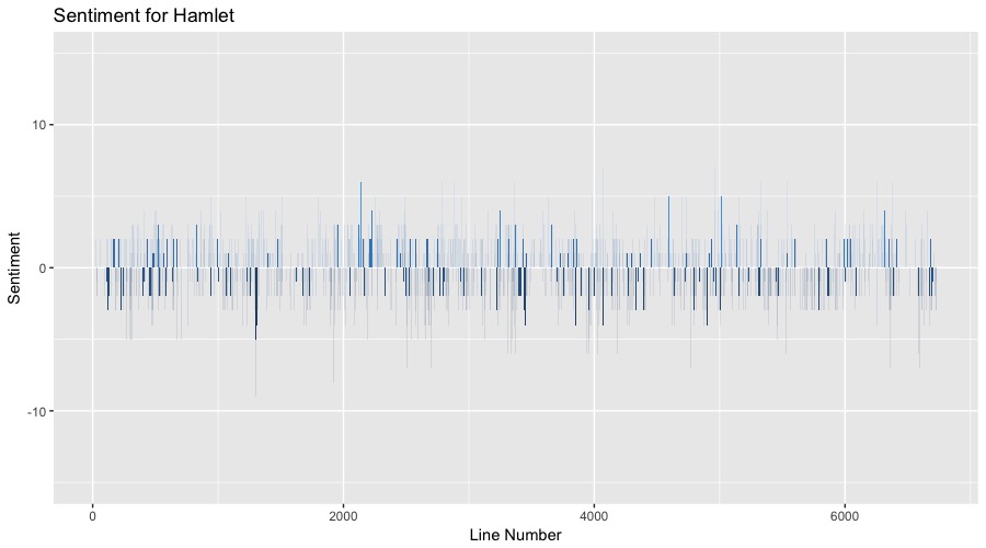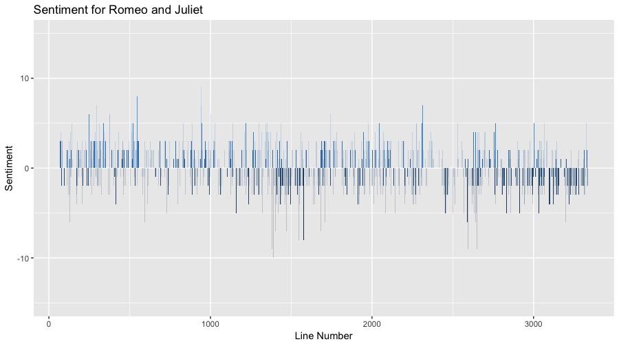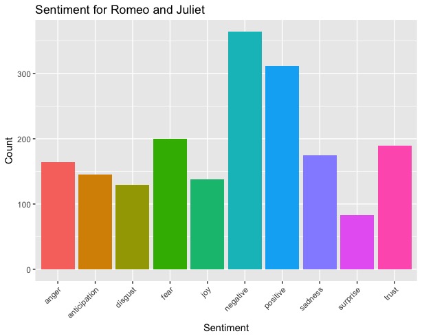 xlab("Sentiment") + ylab("Count") + ggtitle("Sentiment for Romeo and Juliet")