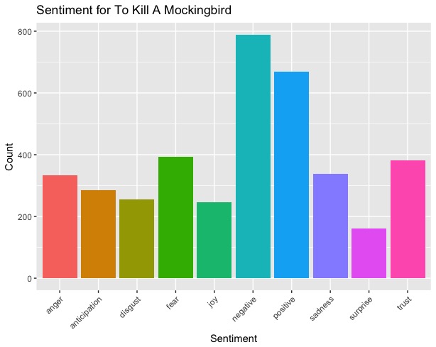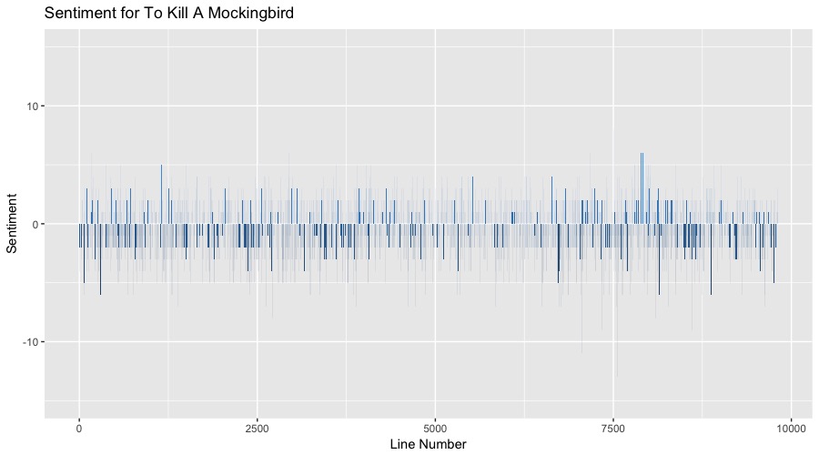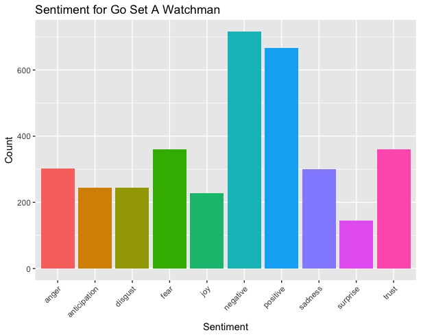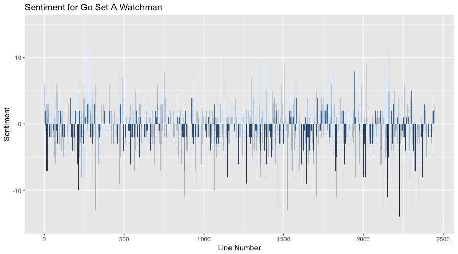 Based on these two charts, it is clear that while they have similar sentiments overall, Go Set A Watchman has much more extreme sentiments throughout the novel, especially in terms of negative sentiment.