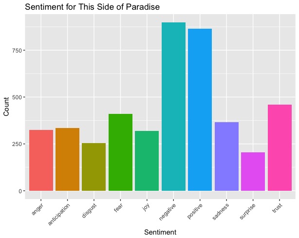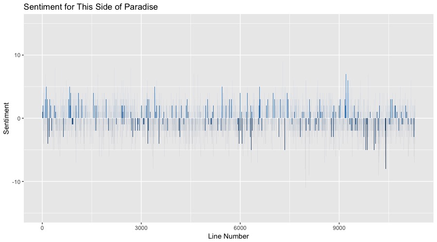 Based on these two charts, it is clear they also have similar sentiment trends, however, This Side of Paradise appears to have slightly more extreme sentiments towards the end of the novel.